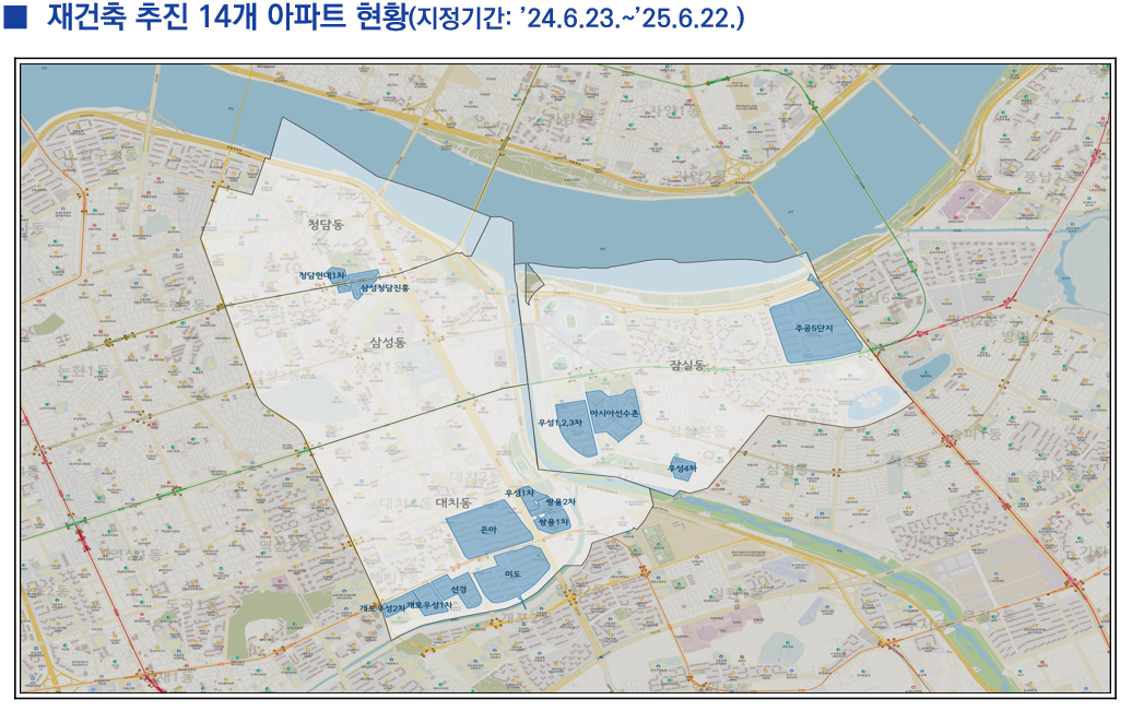 ´ë»ó Áö¿ªÀº °­³²±¸ ´ëÄ¡µ¿, »ï¼ºµ¿, û´ãµ¿ 10°³ ´ÜÁö¿Í ¼ÛÆÄ±¸ Àá½Çµ¿ 4°³ ´ÜÁö ÃÑ 14°³ ´ÜÁö´Ù. ¸éÀûÀº 1.43§´´Ù.